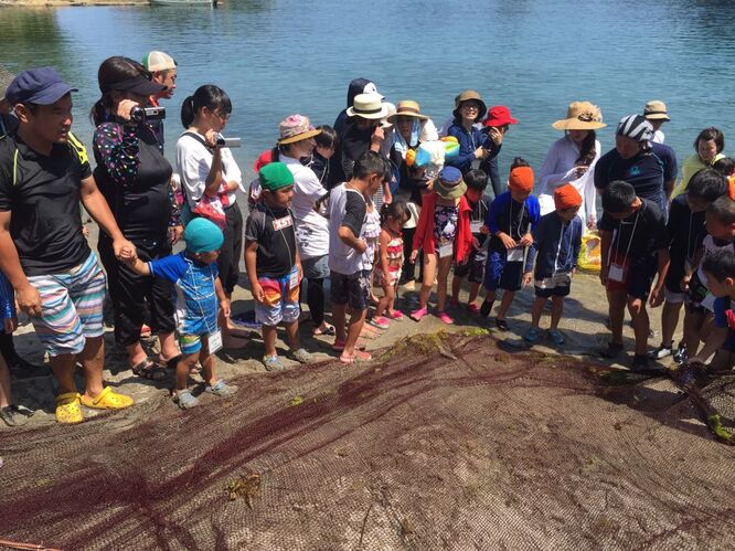120の定員を大きく上回る元気っ子達が香美町三田浜に集合して地引網や氷の中の宝探しゲームを楽しみました。