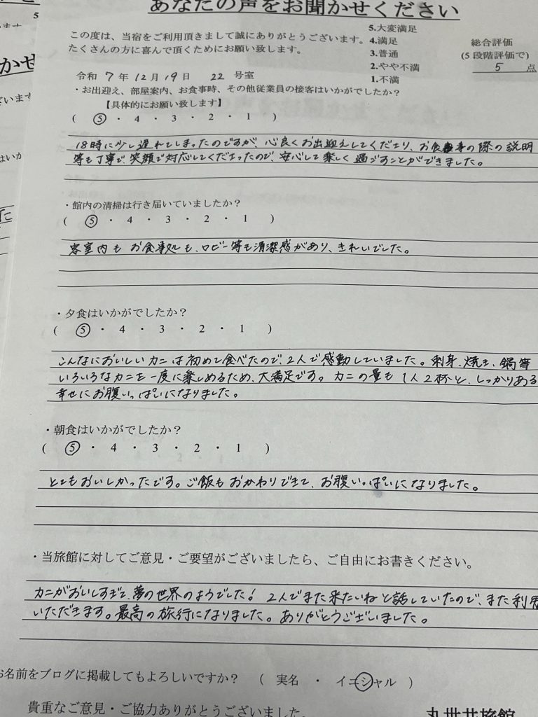 2025.12.22. 今日の香住湾は晴天です。沢山の顧客の皆様に来ていただき心より感謝申し上げます。これから年末年始を迎えられるにあたり、益々のご健勝を祈念しております。お客様から嬉しいアンケート頂いています。「カニが美味しすぎて夢の世界のようでした。2人でまた来たいねと言っていたのでまた来させていただきます。最高の旅行になりました。ありがとうございました。」
