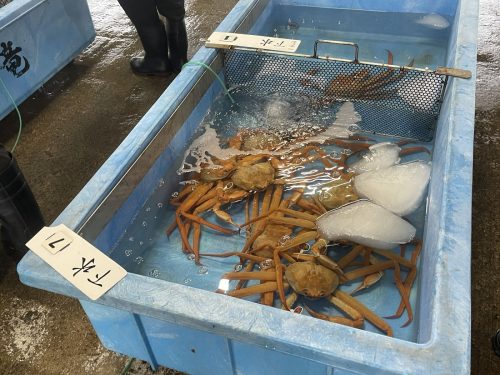 2025.9.25. 今日の香住漁港は曇り空、時々小雨が降りました。今朝は八幡丸の朝競りがありました。大型なので安定して香住ガニを供給してくれます。