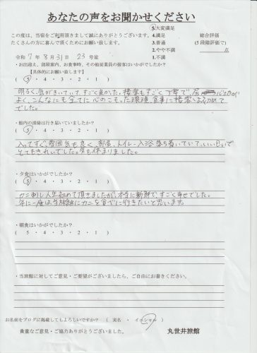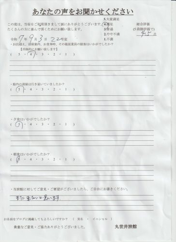 2025.8.14. 昨年の夏もお世話になりました。今年も気持ちの良いおもてなしをいただきありがとうございました。心身共に癒されました。