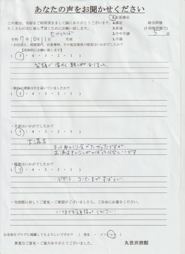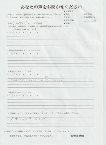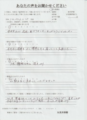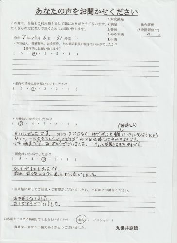 2025.8.11. とてもていねいな接客をしてくださいました。イカが今まで食べた中で一番美味しかったです。サービスもお料理もお部屋も全部が満足です!!また是非来たいと思う旅館でした。。