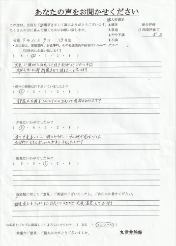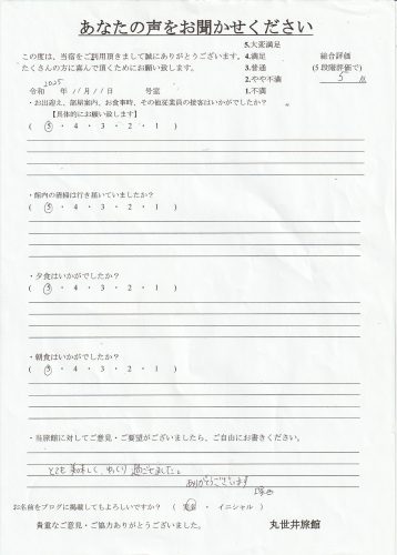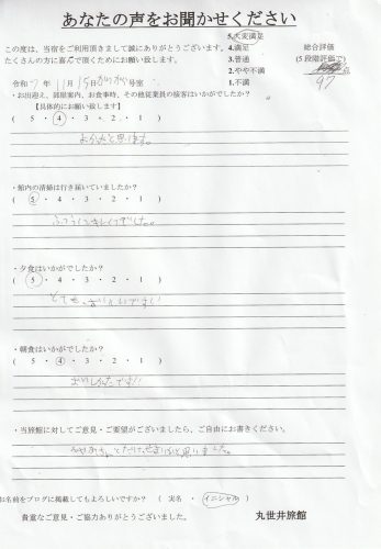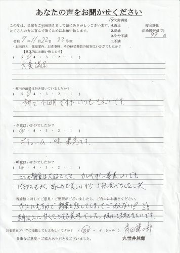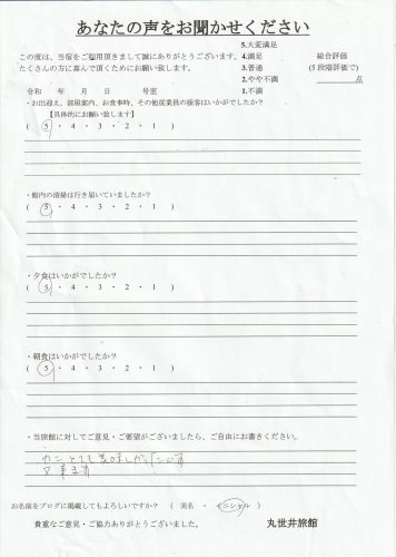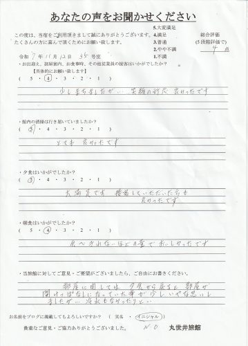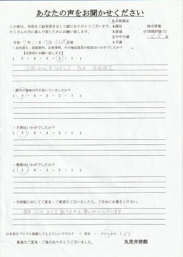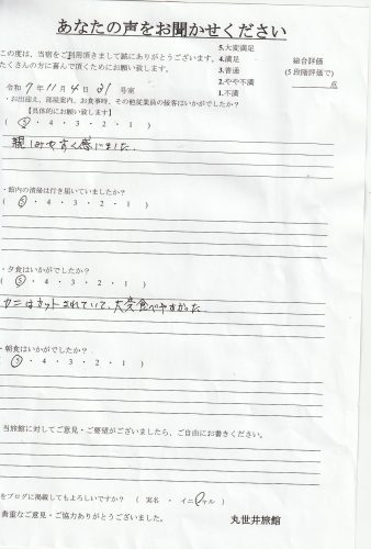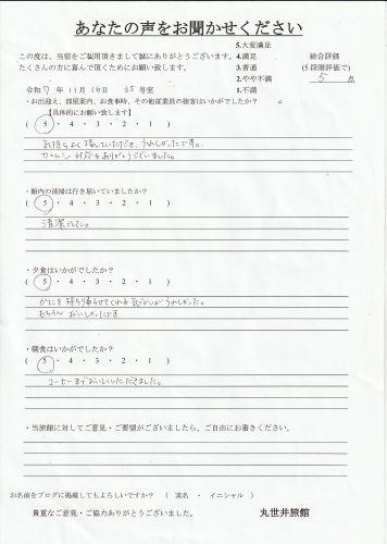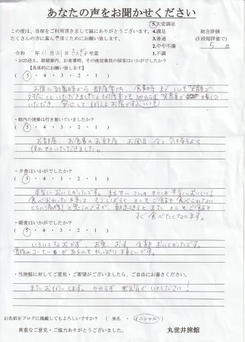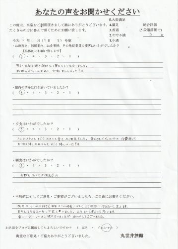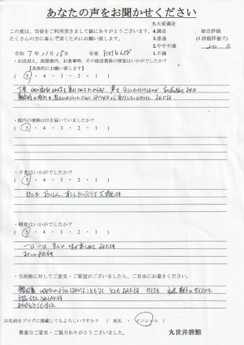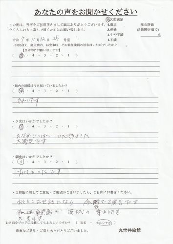 2025.11.4. この度は縁があって「丸世井」様でお世話になり誠にありがとうございました。家内の慰労をかねた小旅行なのでとてもいい思い出となりました。