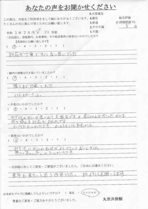 2月14日 対応が丁寧ですごくいい感じでした。タグ付きのカニが食べれて大満足です。また食べきれず残ったカニを持ち帰れる対応も良かったです。カニグラタン美味しかったです。カニ味噌もとても美味しかった。来年も来たいと思う内容でした。またよろしくお願いいたします。