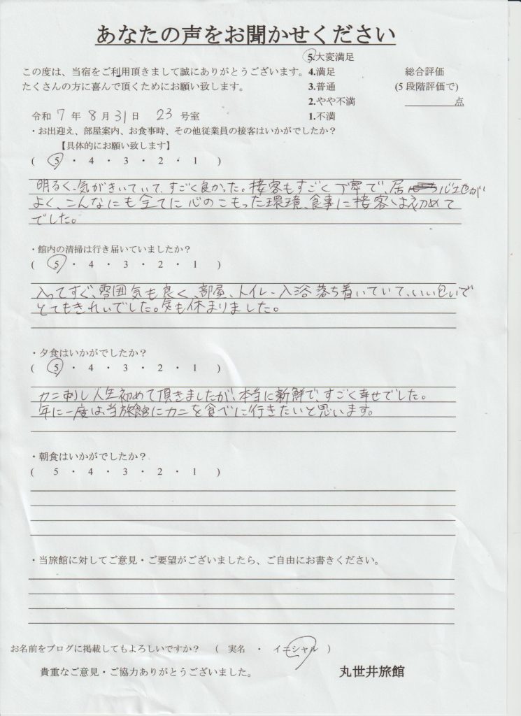 2025.8.31. 明るく気が利いていてすごくよかった。接客もすごく丁寧で居心地が良くこんなにもすべてに心のこもった環境、食事に接客は初めてでした。年に一度は当旅館にカニを食べに行きたいと思います。 2025年9月7日 直販特価でお得!ご予約は↓↓↓ <ネット特価で予約できます> スマホでご覧の方は、タップで即コール! ↓↓↓↓↓ 電話:0796-36-0028(Visited 11 times, 1 visits today)