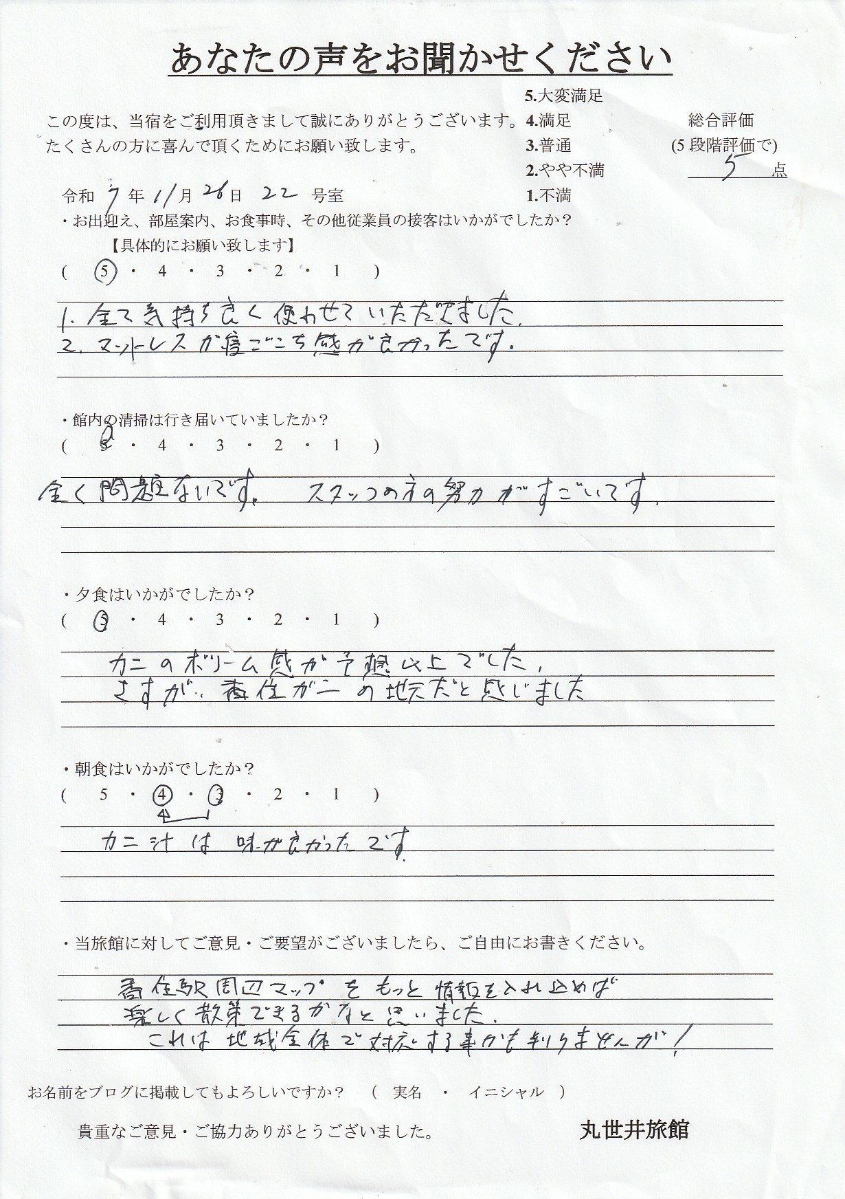 2025.11.26. すべて気持ちよく使わせていただきました。マットレスが寝心地感がよかったです。香住駅周辺マップをもっと情報を入れ込めば楽しく散策できるかなと思いました。これは地域全体で対応することかもわかりませんが!