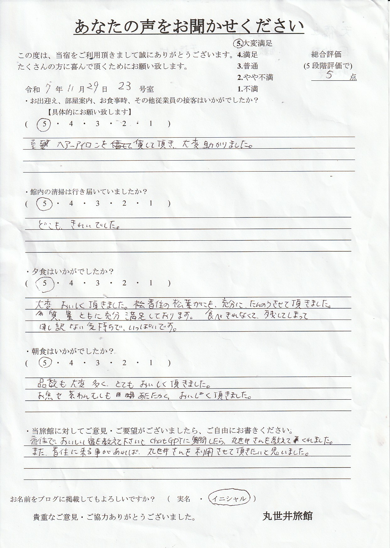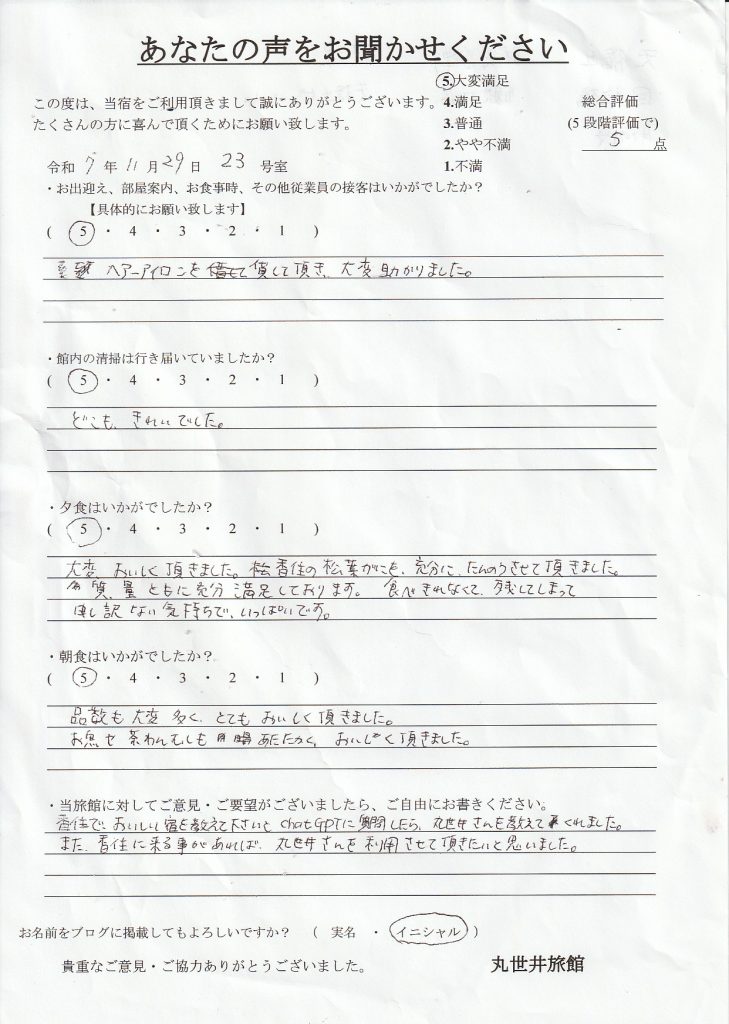 2025.11.29. 香住でおいしい宿を教えてくださいとchatGPTに質問したら、丸世井さんを教えてくれました。また香住に来ることがあれば,丸世井さんを利用させていただきたいと思いました。