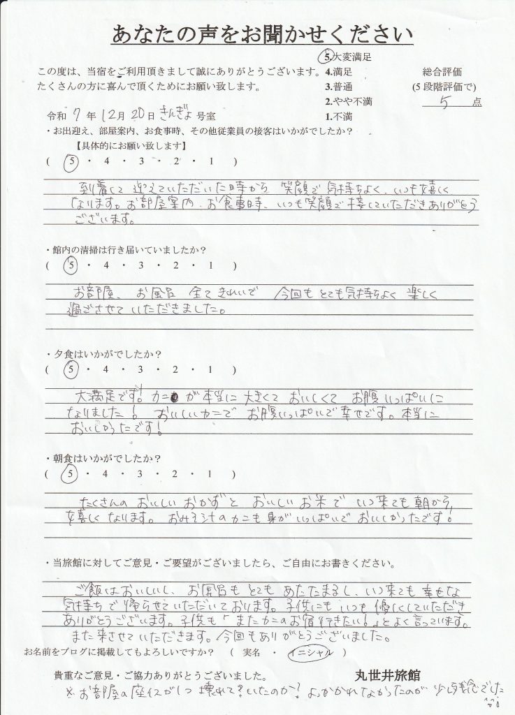 2025.12.20. 到着して迎えていただいた時から笑顔で気持ちよくいつも嬉しくなります。お部屋案内お食事時いつも笑顔で接していただきありがとうございます。ご飯はおいしいし、お風呂もとても温まるしいつ来ても幸せな気持ちで帰らせて頂いています。子供にもいつも優しくして頂いてありがとうございます。子供も「またカニの宿行きたいよ!」とよく言っています。また来させて頂きます。今回もありがとうございました。